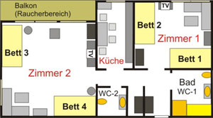Sie kann zimmerweise oder als komplettes 2 Zimmer Appartement zur Unterkunft angeboten werden. Die Wohnung ist für max. 4 (5 mit Zustellbett) Personen ausgelegt.